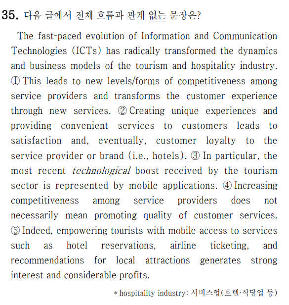 각 문장은 ICT 발전, 서비스 변화, 경쟁 증가, 모바일 기술의 역할 등을 다루고 있습니다.