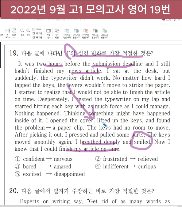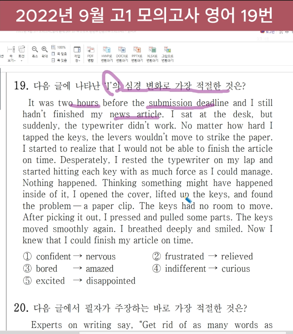 문제를 봅시다. "I"의 심경 변화로 적절한 것은? 답 한개를 고르는 문제죠. 본문을 보면 강조 문구가 없습니다.